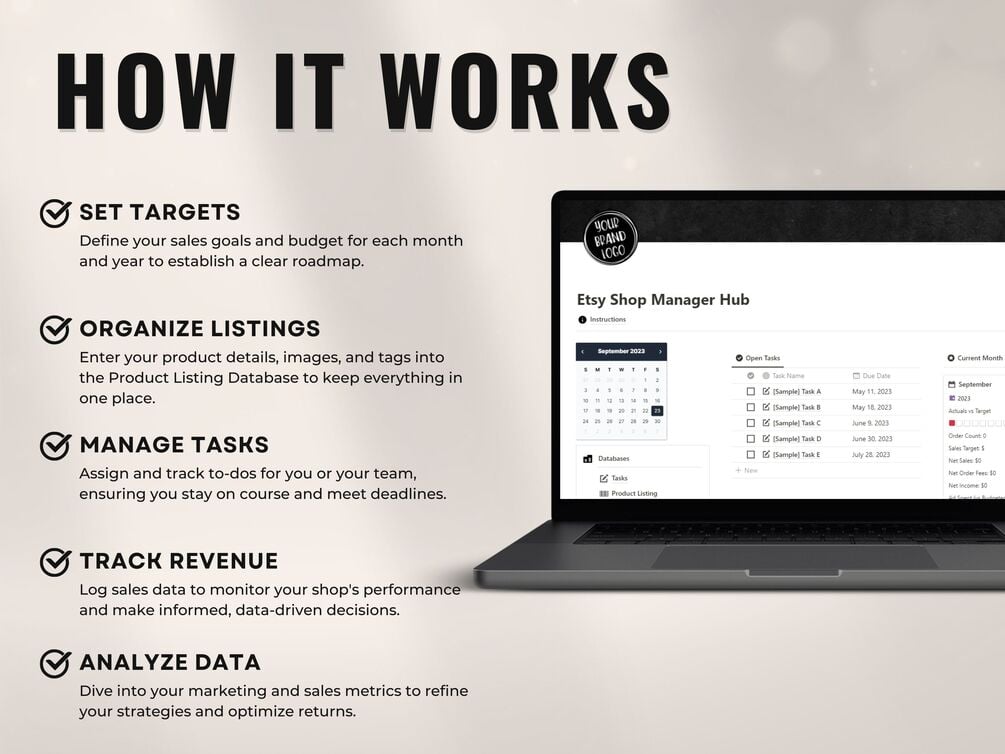 What's Included: Instruction Guide: A step-by-step guide to get the most out of this Notion tool. Task Management Database: Efficiently manage tasks, due dates, and notes. Product Listing Database: Consolidate vital product information in one place. Sales Tracker Database: Deep-dive into revenue analytics for better decision-making. Marketing and Expense Databases: Keep track of advertising costs and listing fees for a complete financial overview. Monthly and Yearly Planning Databases: Strategic planning and analysis databases to track your growth.