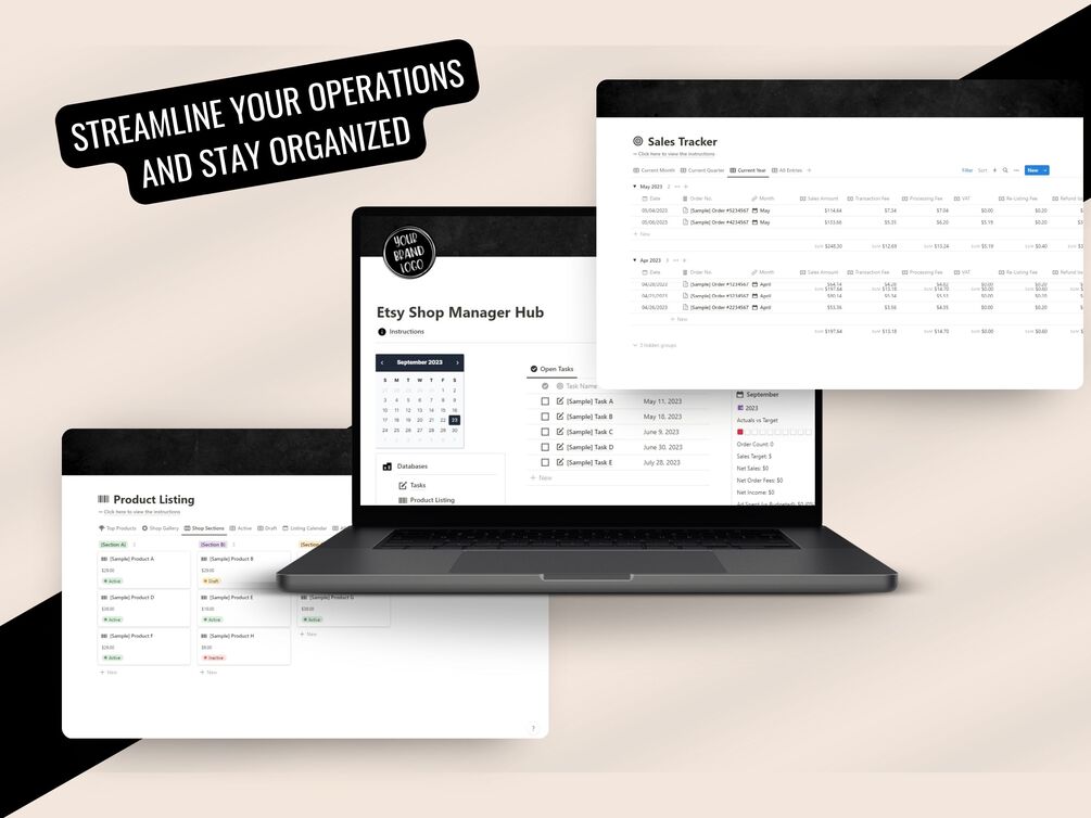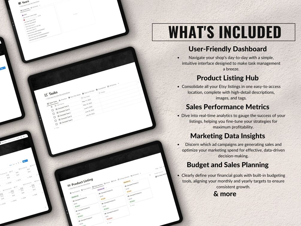 What's Included: Instruction Guide: A step-by-step guide to get the most out of this Notion tool. Task Management Database: Efficiently manage tasks, due dates, and notes. Product Listing Database: Consolidate vital product information in one place. Sales Tracker Database: Deep-dive into revenue analytics for better decision-making. Marketing and Expense Databases: Keep track of advertising costs and listing fees for a complete financial overview. Monthly and Yearly Planning Databases: Strategic planning and analysis databases to track your growth.